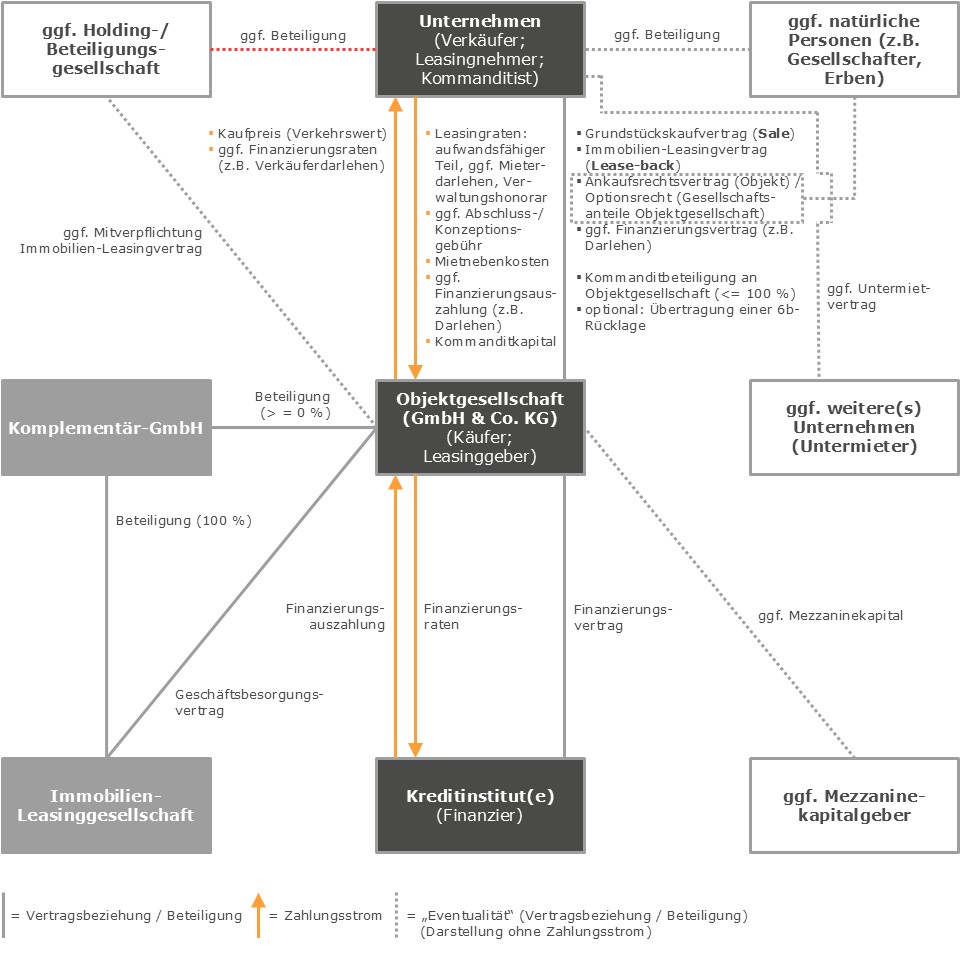 Sofern Unternehmen (z. B. aus standortintensiven Branchen wie dem Einzelhandel, der Hotellerie oder Pflege) ein Immobilienportfolio in eine Sale-and-Lease-back-Transaktion einbringen möchten, kann dies ggf. auch in der Form erfolgen, dass mehrere oder alle Immobilien des Portfolios in eine Objektgesellschaft eingebracht werden. Inwieweit eine Bündelung erfolgen kann, hängt jedoch von diversen Faktoren im Hinblick auf gewünschte Gestaltungseffekte ab. So kann es z. B. im Hinblick auf die Kommanditbeteiligung an der Objektgesellschaft und der damit in Verbindung gebrachten Effekte sinnvoll sein, so viele Objektgesellschaften einzusetzen, wie es Eigentümergesellschaften im Unternehmen gibt.